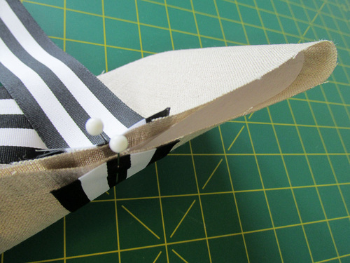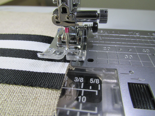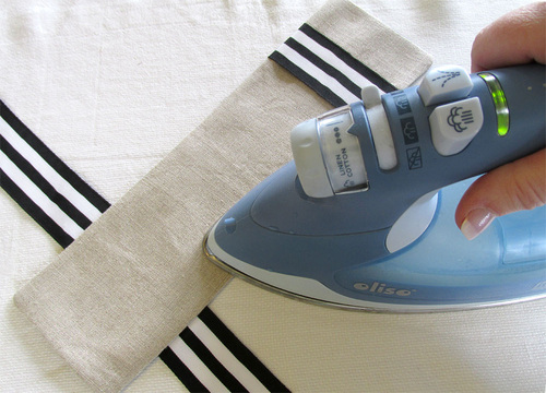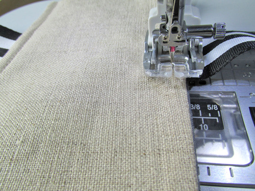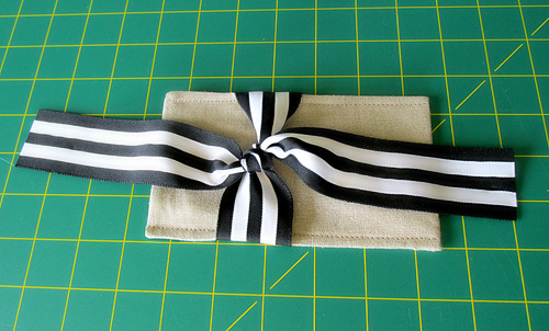We went classic with our color combo, choosing a natural linen with a tuxedo stripe black and white ribbon. It would be perfect for a rustic wedding or a special anniversary dinner. But, you could just as easily go color-block bright or choose a novelty print for a special party theme. We do recommend staying with two lighter-weight fabrics for the exterior and lining, otherwise the layers for the final edgestitching might become too thick to handle smoothly.
