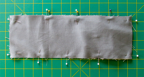 - Fold the panel wrong sides together, aligning all the raw edges. This is just to double check that your top ribbon lengths are perfectly aligned with your bottom length. Unfold, adjust, and re-pin if necessary.