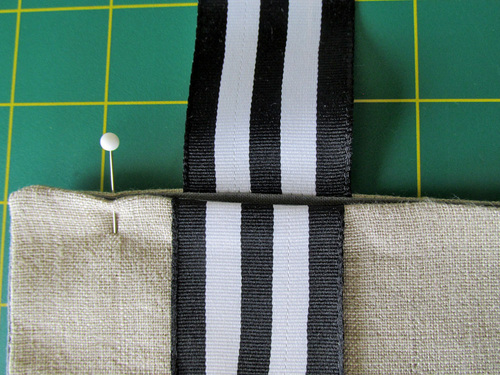 - Find the lining panel. Place the front panel and lining panel right sides together. Pin all around, leaving an approximate 2” opening for turning along one side near the bottom. We left our opening just above the horizontal ribbon, marking it with a set of double pins.