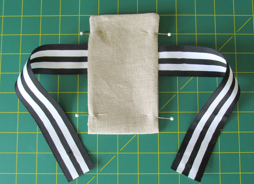 - Still working with the front piece, find the three lengths of ribbon and position them on the fabric panel. The 4½” length goes at the bottom with the outer edge of the ribbon sitting 2” up from the bottom raw edge of the fabric.