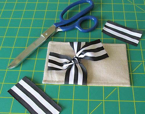 NOTE: Why didn’t we just start with shorter ribbon lengths? Because it’s very hard to tie a pretty knot with stubby little ribbon tails. You’ll get a better look with longer tails that you can then trim to fit within the finished panel.
