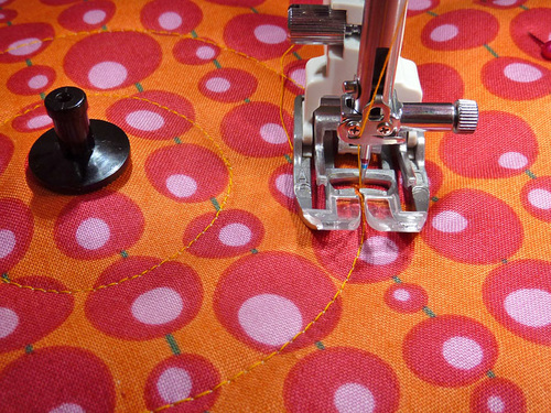 A round warmer deserves some matching circular quilting. We used the Janome Circular Sewing Attachment, which is a great way to make perfect concentric circles. If you do not have this accessory, you can draw in concentric circles, using the lines on our downloadable circle templates as your guide.