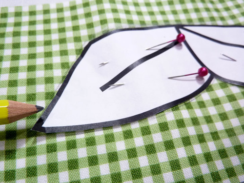 NOTE: If you are new to appliqué, take a look at our full tutorial: How to Appliqué like a Pro. - Place the leaves template back into position. Fold along the “vein” in one leaf and trace along this line.