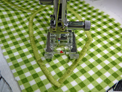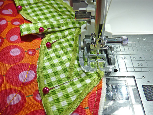 - Set up the machine for an appliqué stitch. We used a tight satin stitch. Re-thread the machine with cotton thread to match the fabric in the top and bobbin.