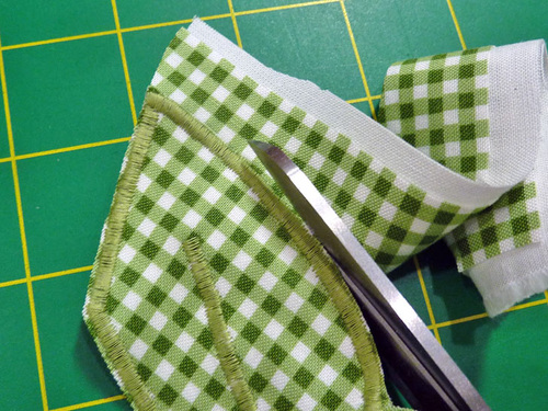 As mentioned, we chose a fabric that reminded us of a pretty red tomato. The green gingham gave us a petite print that worked well for the small surface areas of the binding, leaves, and hanging loop. And, a plain cotton in a white or very light color is the best choice for the inside. You might have appropriate scraps just waiting in your stash.