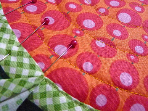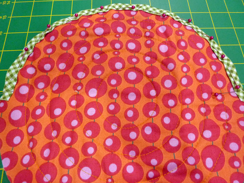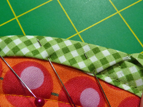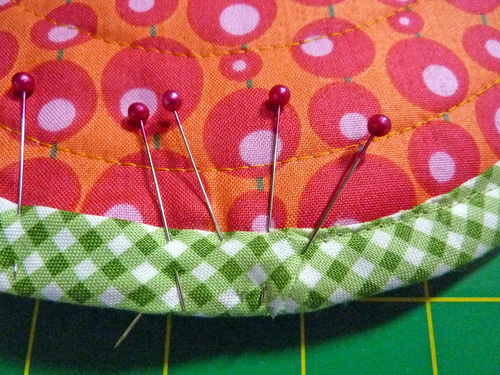 - Slip the binding over the raw edge of this ONE circle. It should cover just a bit over one half of the circle. If you have a directional motif as we did, make sure your motif remains straight when placing the half circle. Pin in place through all the layers.