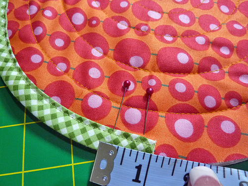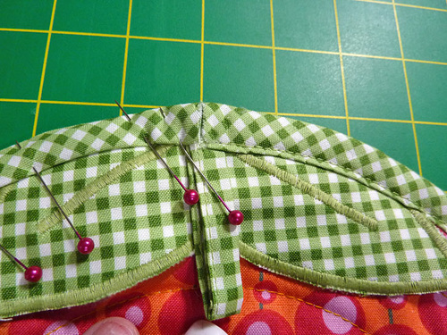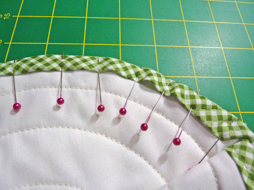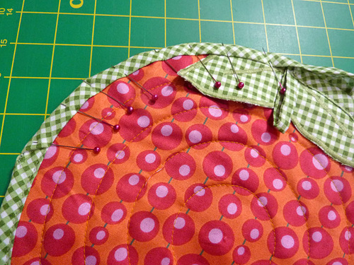 - Pin from the point of the hinge overlap back up to the center top starting point. Remember, you are now once again wrapping the binding around both layered circles.