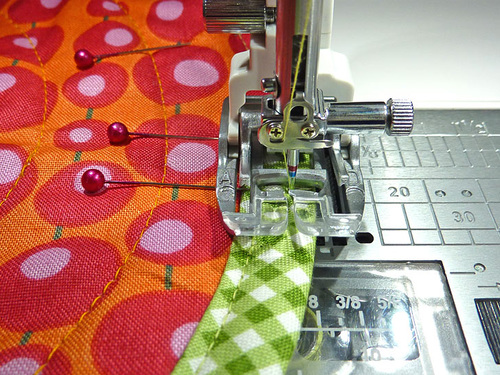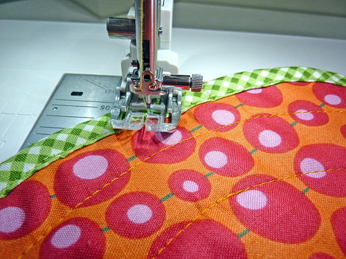 - Edgestitch the half circle of binding in place. Go slowly and carefully to insure you are catching both sides of the binding in this one seam.