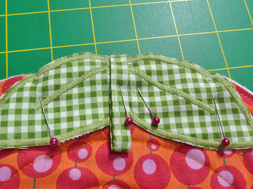 - Find the remaining length of binding. Starting at the top center point (the top with the leaves and loop), give yourself about 1” at the head and then slip the binding over the raw edges of the layered circles. Pin in place as you move along the curve of the circle.