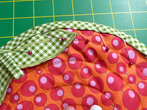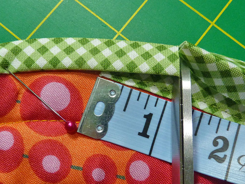 - At the top back, trim away the excess fabric from just the back half of the binding so there is just enough to allow a narrow overlap. Simply tuck under the overlapping raw edge at a diagonal (to match the overlaps at the sides) and pin in place.