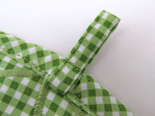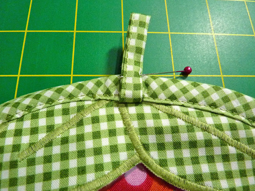- Fold the loop up into its final position, covering the raw ends of the binding. Pin in place.