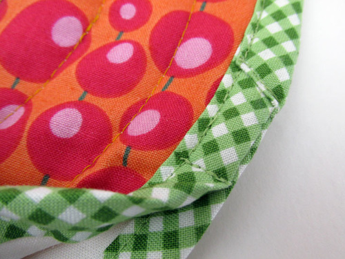 The construction method to create the warmer is quite simple, but we do recommend reading through the steps once or twice to “make it in your head.” The front and back quilted circles are bound with a clever snip-fold-wrap-and-stitch method. You just need to pay attention to when you’re binding one quilted layer and when you’re binding both quilted layers.