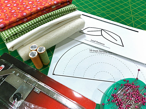 NOTE: Extra yardage allows you to cut the bias binding strips as one continuous length. You could get away with less fabric by cutting shorter strips and seaming them together to get the final finished lengths. - 100% cotton thread for construction as well as the appliqué; you need three colors to match the exterior, the lining, and the binding/leaves