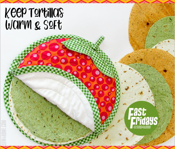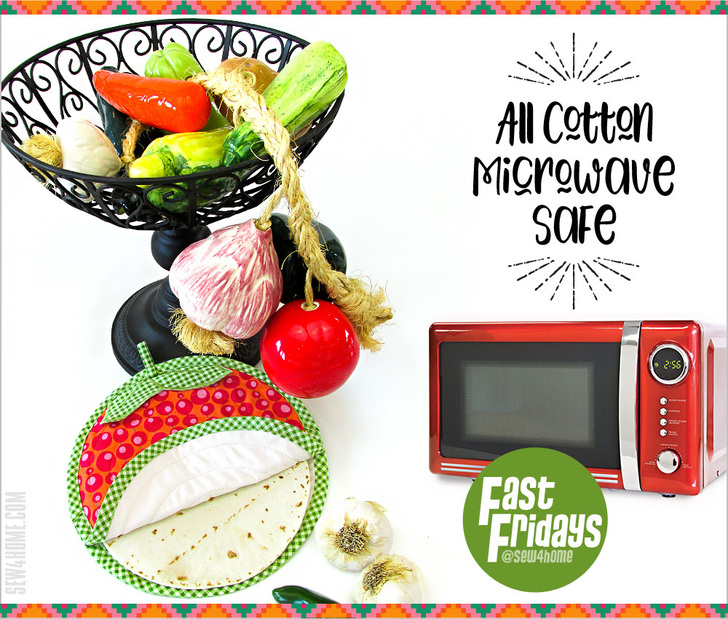 Because this warmer is meant for the microwave, all natural cotton was used for the fabric, batting, and thread. This is important to avoid any melting or sparking issues in your microwave. We used Pellon Wrap-N-Zap for the batting since it is made specifically for the microwave from 100% natural cotton batting. Not only is this microwave safe, it also helps trap moisture to create an evenly warmed tortilla or flatbread.