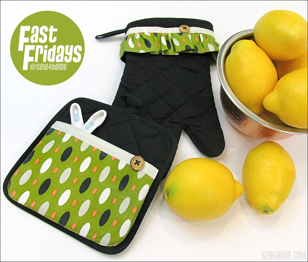 Start with an off-the-shelf hot pad and mitt set – we found ours for $2 – add some simple fabric and trim details and voila, stye on a shoestring. This fun project fits not only in the Fast Fridays category, but is also an excellent ScrapBusters project since you need just a bit o’ fabric and trim and a couple wooden buttons.