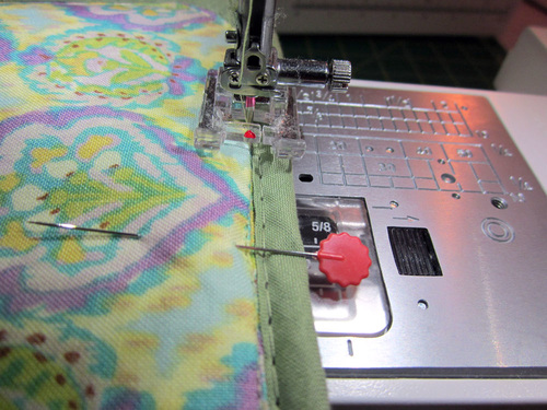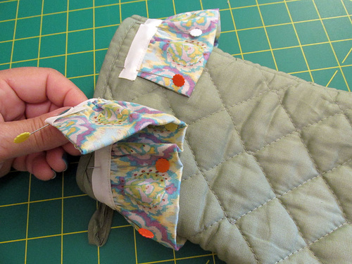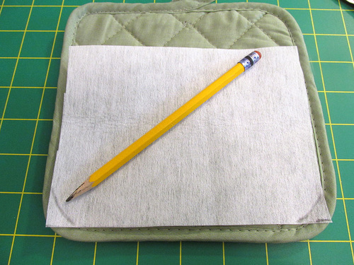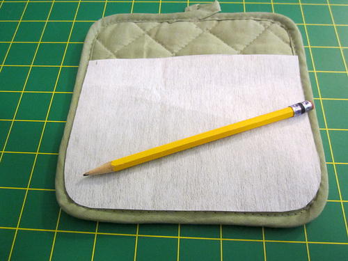 - Set the pocket into position on the hot pad. Pin the pocket in place on the hot pad along both sides and across the bottom.