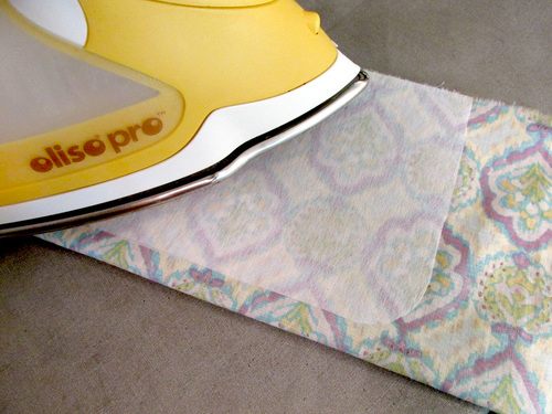 - Place the fusible interfacing on the folded scrap. The top straight edge of the interfacing should be flush with the raw edges of the folded scrap. Following manufacturer’s instructions, fuse in place.