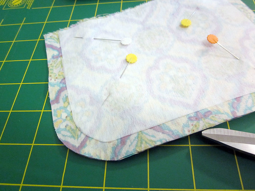 - Trim around the fused interfacing by ½” along the sides and across the bottom. You can “eyeball it” as we did or draw in a ½” seam allowance line with a fabric pen or pencil. Pin the layers together, leaving an approximate 3” opening along the top straight edge for turning.