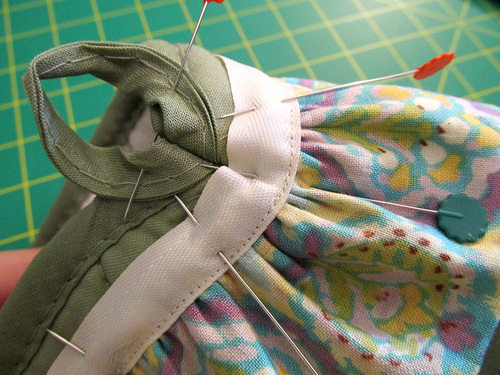 - Center the twill tape along the top seamed edge of the pocket. The top edge of the twill tape should be flush with the top seamed edge of the pocket. Wrap the raw ends around to the back of the pocket. Pin in place.