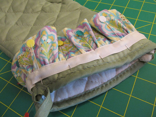 - Start with the underlap (remember, that’s the side with the shorter twill tape extension) positioned on what will be the “front” of the mitt above the thumb. Center the needle over the previous line of stitching that secured the tape to the ruffle.