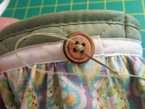 - Hand sew a wooden button in place through all the layers at the overlap. We used a pretty “X” stitch.