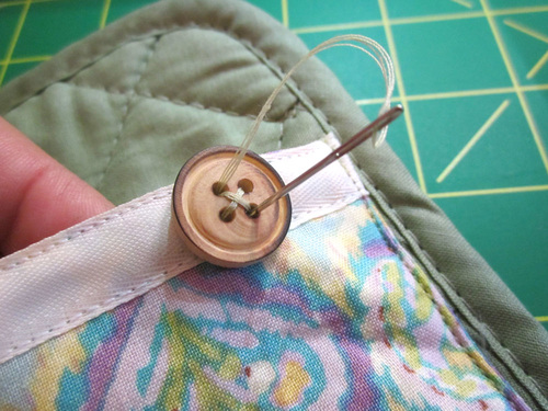 - Hand sew a wooden button in place through all the layers of just the pocket. As above, we used a pretty “X” stitch.