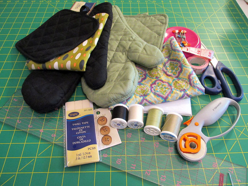 We recommend starting with a base pad and mitt in a solid color. This lets your quilting cotton accents really stand out. We chose both a celery green and a deep black and also spotted red, yellow, gray at the store we visited. Cotton twill tape adds the a perfect dividing line along the top of the mitt ruffle and the hot pad pocket.