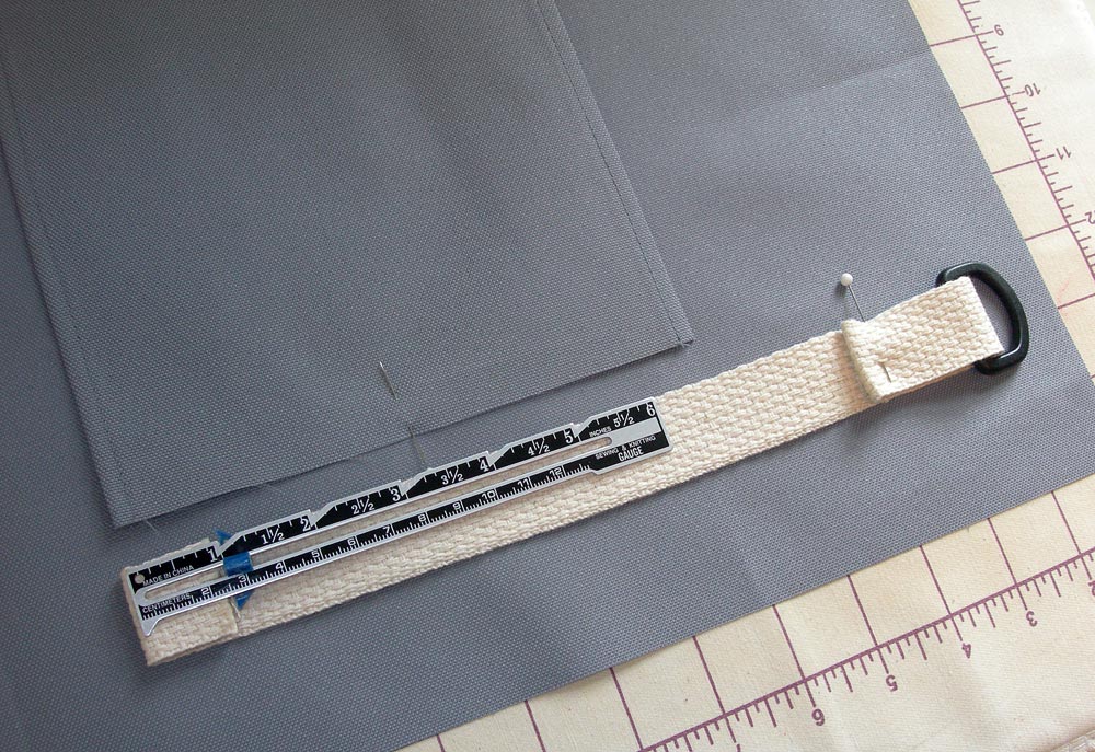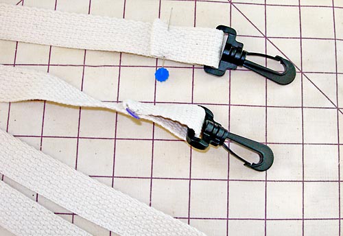 - Fold each end under ½”, loop each end through one of the swivel hooks, then fold it back on itself 2″. Pin in place to secure. Make sure you fold back both ends to the same side of the webbing.