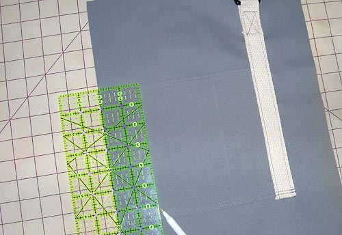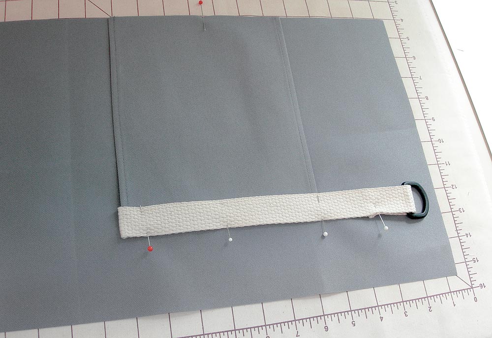 - Slip the strap over the right side of the pocket so the bottom end wraps under the hem. The raw edge of the pocket should be centered under the strap. Pin in place.
