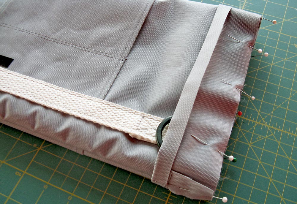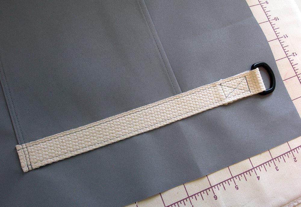 - Find one of the 14″ lengths of cotton webbing. Fold under 1″ on end and press. Fold the other end under ½”, loop it through one of the D-rings, then fold it back on itself 2″. Pin in place to secure the D-ring.