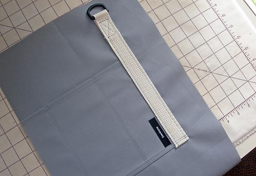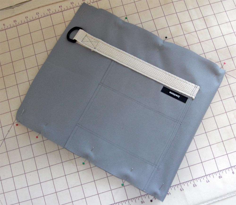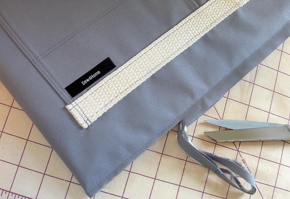 - Stitch a second parallel seam 1/8″ from first, each one towards the inside of the pocket. In other words, to the right of the leftmost seam and to the left of the rightmost seam (how’s that description for mind boggling?!). Here’s a picture… maybe that will help. We added our Sew4Home label next to the strap.