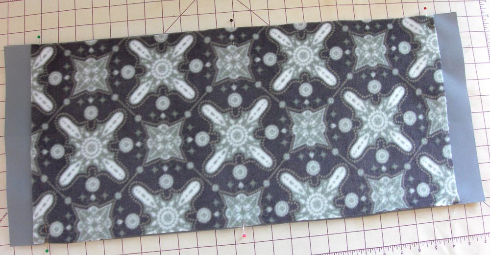 - Center the 23″ x 11″ fleece panel on top of it, so the fleece is facing right side up (the wrong sides of both fabrics are together).