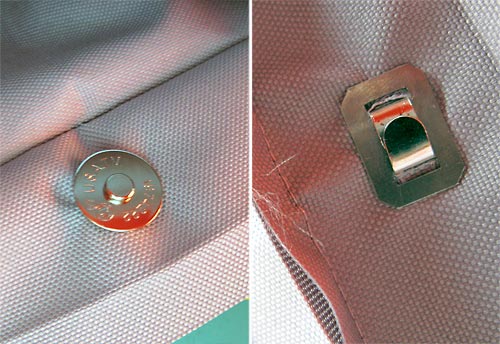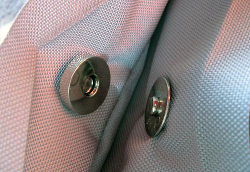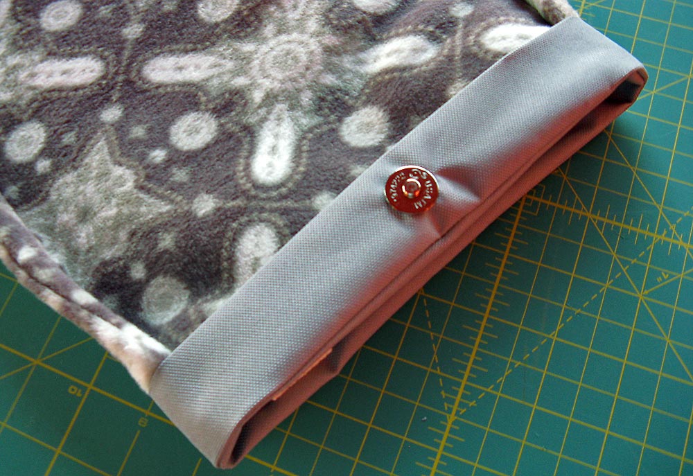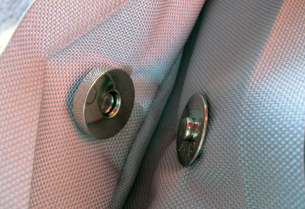 - Open the facing and insert the magnetic clasp, following the manufacturer’s directions (it’s really easy… you just poke the prongs through the fabric, slide the locking disk in place and bend the prongs over it). Center the clasp side to side and top to bottom between the facing’s seam and hem. Make sure you insert the clasp from front to back.