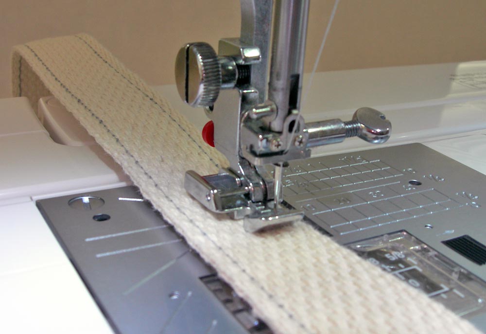 - Using the Zipper foot again, which will allow you to both stitch close to the edge of the webbing and get as close as possible to the swivel hook, stitch along both sides of the entire strap and make a box with a X at each end to secure the fold-back. Similar to what you did with the straps you stitched directly to the bag.