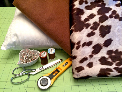 - ½ yard of 54″+ wide faux leather fabric or similar for the pillow front; we originally used 54″ Udder Madness Cowhide Upholstery in Milk – we found a similar 55″ wide fabric at Joann Fabrics