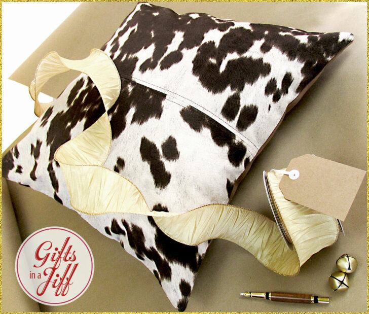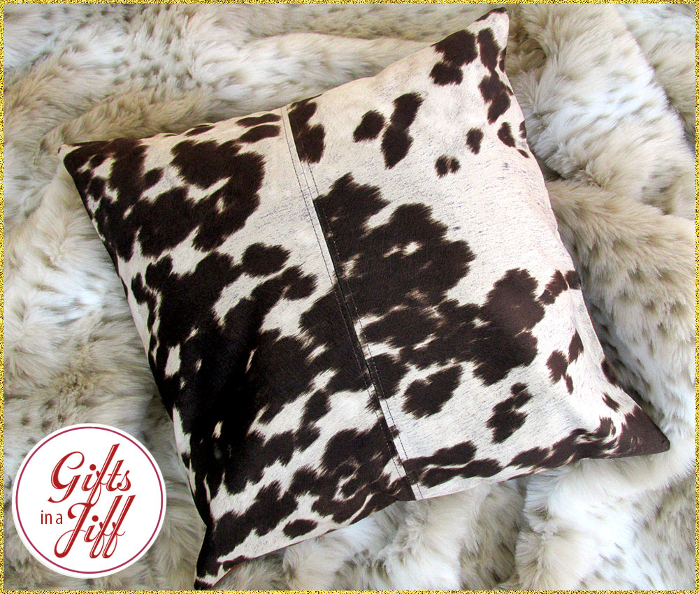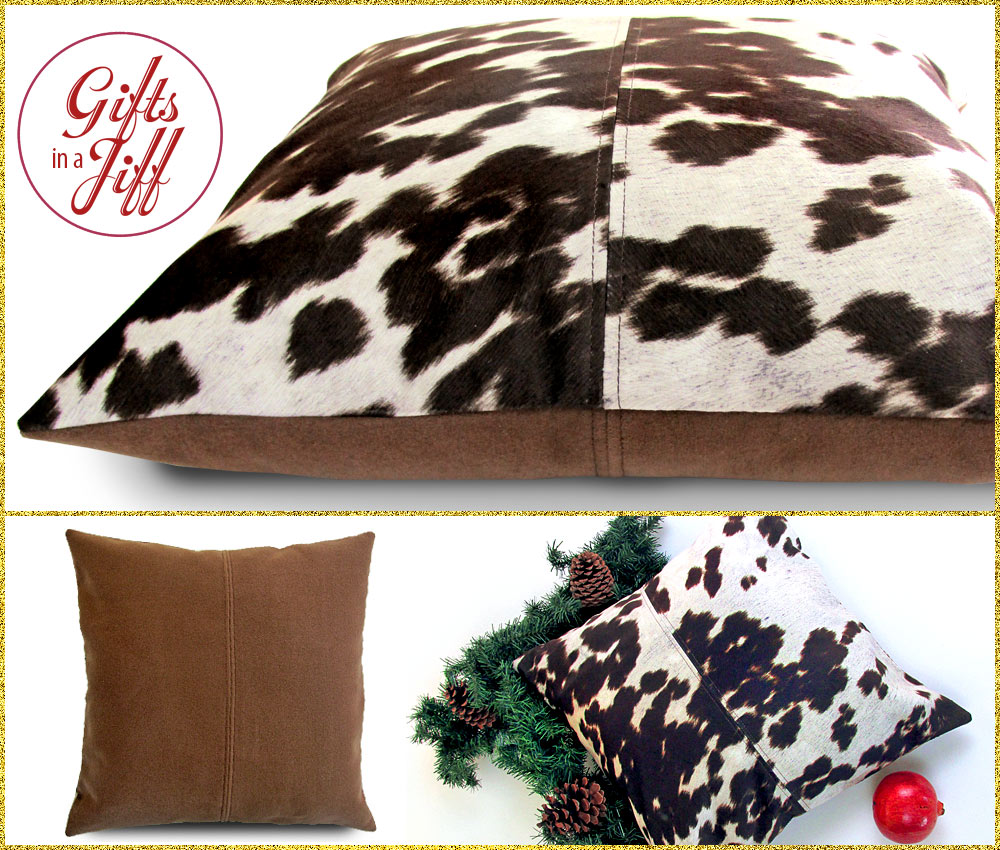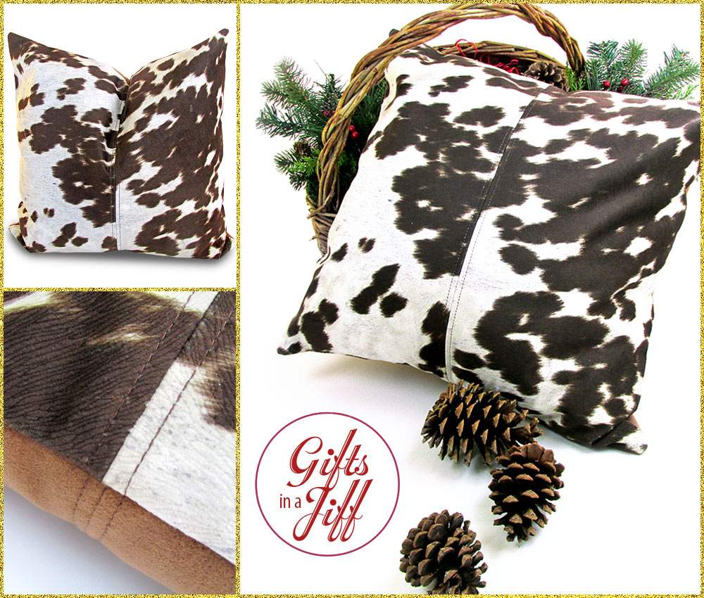 You needn’t be a cowboy or cowgirl to fall in love with this excellent accent pillow. The faux cowhide is 100% polyester with a heavy, velvety feel. Continuing our theme of imitation as the greatest (and humanest) form of flattery, we’ve paired it with a thick, rich faux suede, also 100% polyester. The design is very chic yet super quick. You could whip out a whole herd of pillows in a single afternoon.