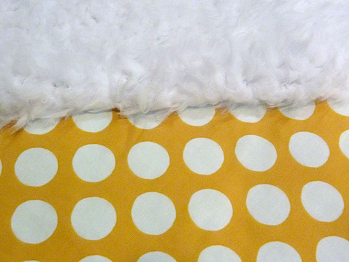 - Place the front and back panels right sides together, matching up cotton to cotton and faux fur to faux fur.