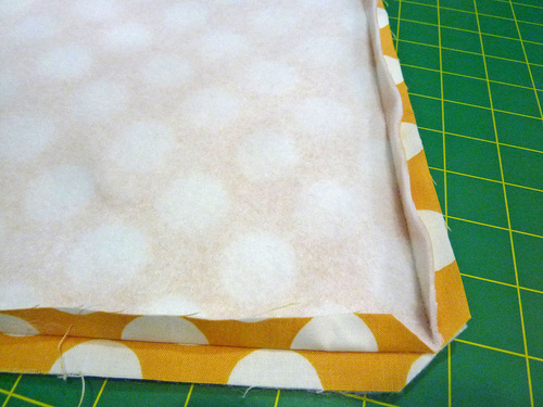- Place the fusible fleece against the wrong side of the cotton square. All sides of both layers should be flush. Following manufacturer’s instructions, fuse in place.