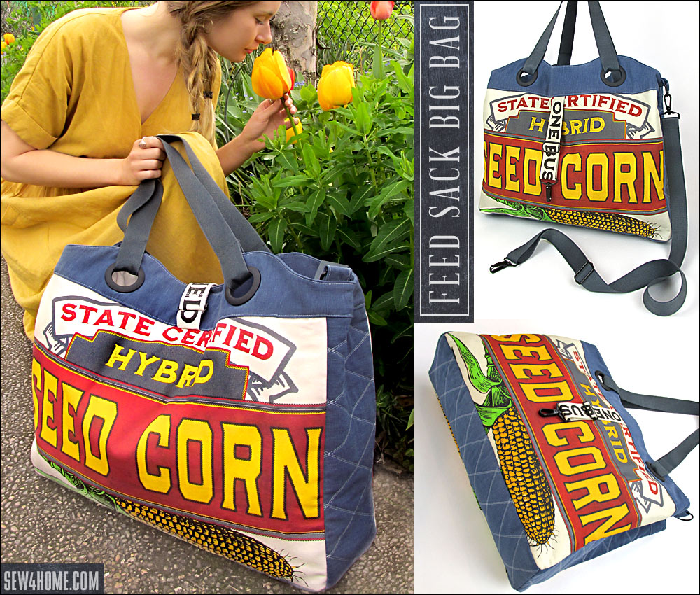 Our Feed Sack Big Bag finishes at approximately 21” wide x 16” high x 6” deep with both handles and a fully adjustable shoulder strap.