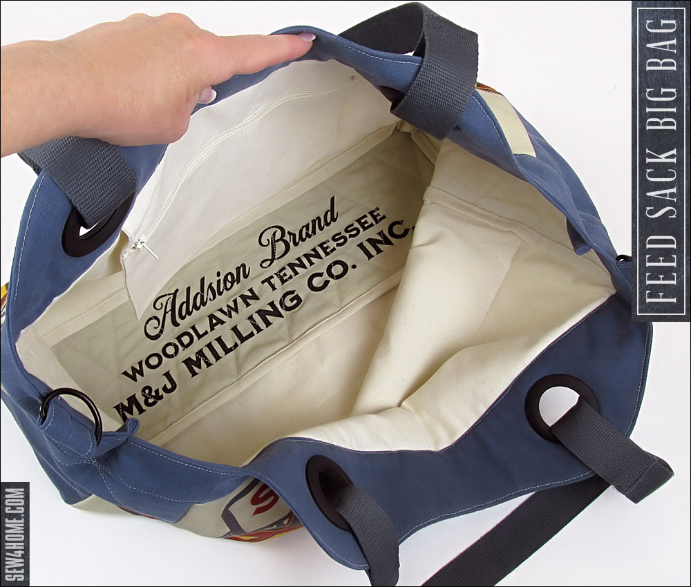 This tote is meant to be soft and slouchy so it can flex to hold whatever you need to carry. Because of this, we didn’t want the top to be too tightly structured; it should be able to open wide or cinch down, depending on the task. Our closure solution is a mini adjustable strap that loops from the back to the front and clips closed with a Swivel Hook and Rectangle Ring. It’s fussy cut from the feed sack fabric to feature the words, “ONE BUSHEL.”