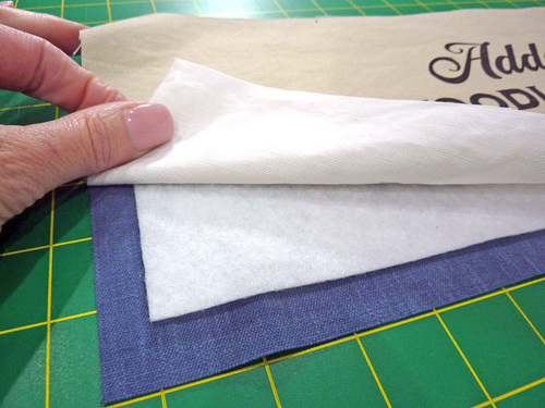 - On the main panels and the side panels, the fusible fleece should be centered so there is ½” showing along either side and across the bottom and ¾” showing along the top. Following manufacturer’s instructions, fuse in place.