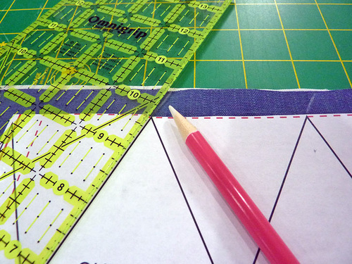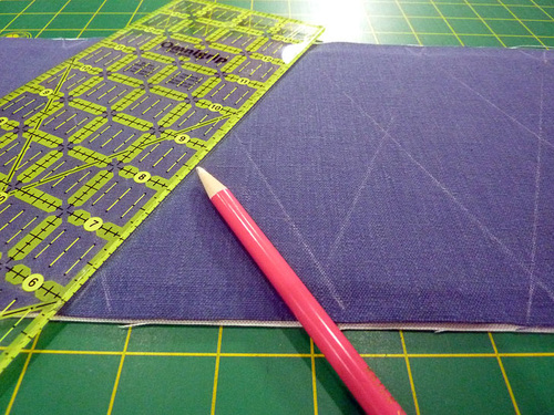- Start with the side and base panels. Find the assembled templates. Trim the templates along the dotted line. Center the template on the layered panel – remember, there is one template for the sides and one for the base. With the template centered, trace the ends of the diamond pattern stitching lines onto the fabric along each edge.