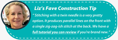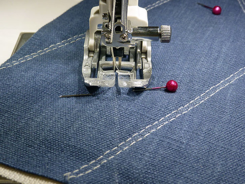 NOTE: Any time you are working on the right side of your fabric, remember to choose a fabric tool whose marks can be easily removed or that will vanish with exposure to the air or the heat of an iron. - Thread the machine, top and bobbin, with the contrasting thread you’ve chosen for all your topstitching. We used natural. Insert a twin needle. Slightly lengthen the stitch.