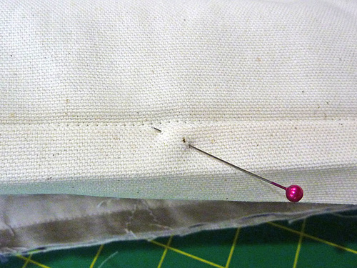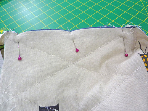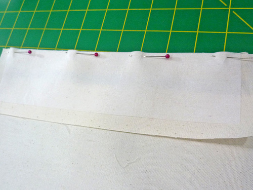 - To do this, find the exact center along the top of each side panel and pinch about ½”. Take care to keep the top edgestitching aligned. Pin and/or clip in place.
