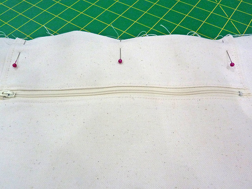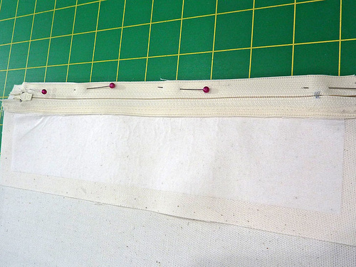 - Place the smaller top section right sides together with the top edge of the zipper tape. Pin in place.