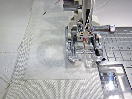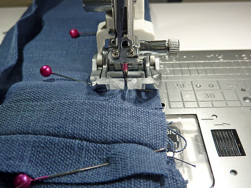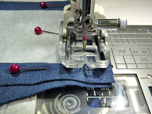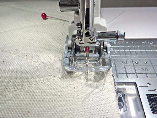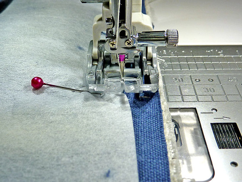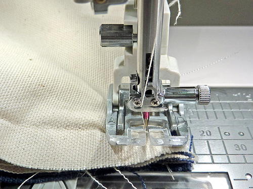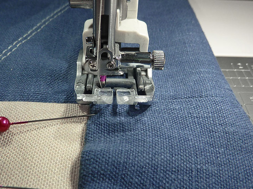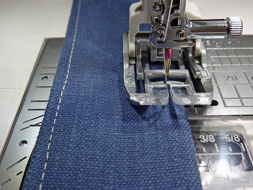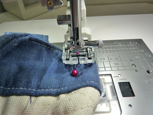 - Re-thread the machine if necessary with the contrasting topstitching thread in the top and bobbin. Slightly lengthen the stitch. Stitch all the way around staying close to the bottom fold. Go slowly and carefully, keeping your stitch line straight and making sure you are catching both the front and back evenly in this one seam.