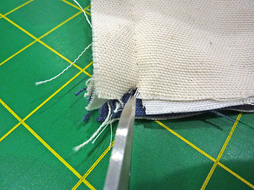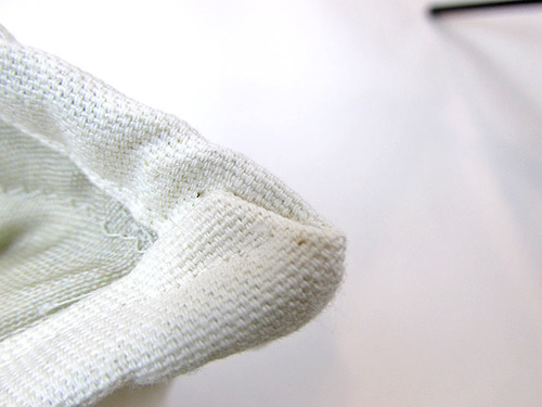 - Grade the seam allowance back to ¼”, using pinking shears if possible. This pinking creates a very smooth curve. Turn right side out, smoothing that curve with a long, blunt tool, and press well. Re-press that bottom ½” hem on the exterior as needed.