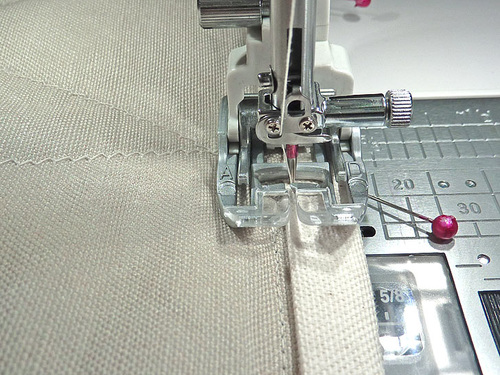 - Edgestitch along the inner fold of the binding through all the layers. Go slowly and carefully to insure you are catching both sides of the binding in this one seam. Remember, you are just stitching the binding around the seam allowance; you should not be stitching onto the main panels at all. If your machine has the ability to adjust the needle position, you can use that feature to move your needle to the left to allow you to get as close as possible to the seam line.