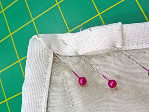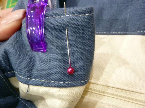- Bring the accent band up and over to the exterior of the bag. The bottom folded edge should now just cover the seam line you just made. Take the time to measure the width of the band at several points to insure the accent band reveal is even all around. Pin in place.
