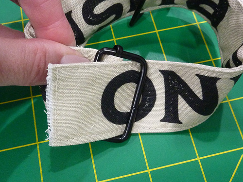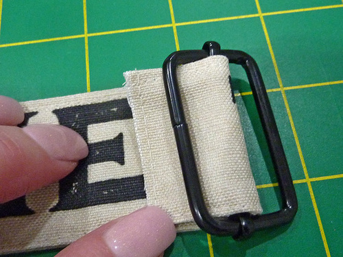 - Bring this raw end up and over the center bar of the Adjustable Slide Buckle – on top of the original layer.